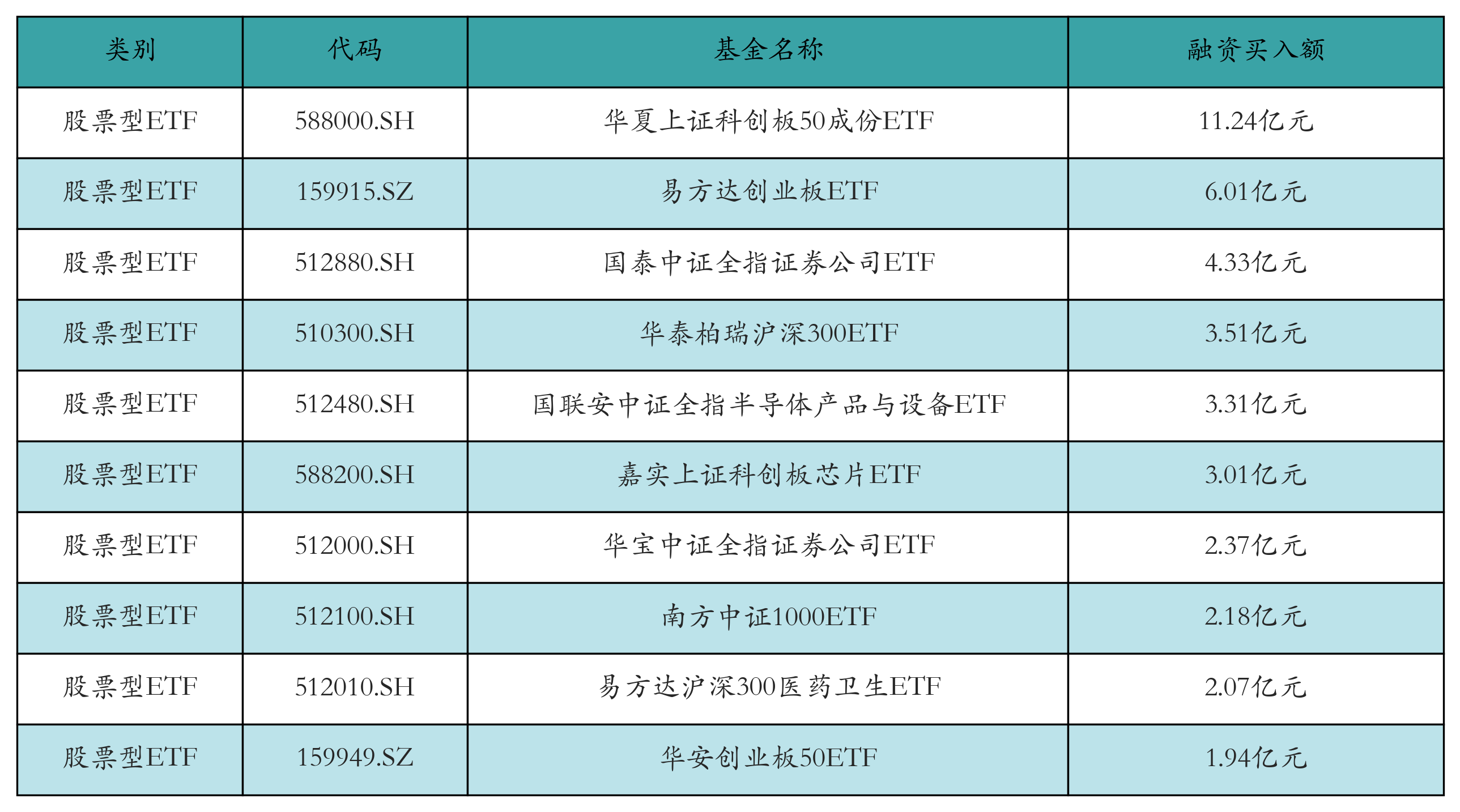 上一交易日股票型ETF融资买入额最高的3支ETF及其买入金额分别为:华夏上证科创板50成份ETF(11.24亿元)、易方达创业板ETF(6.01亿元)、国泰中证全指证券公司ETF(4.33亿元)。融资买入额前10详情见下表: