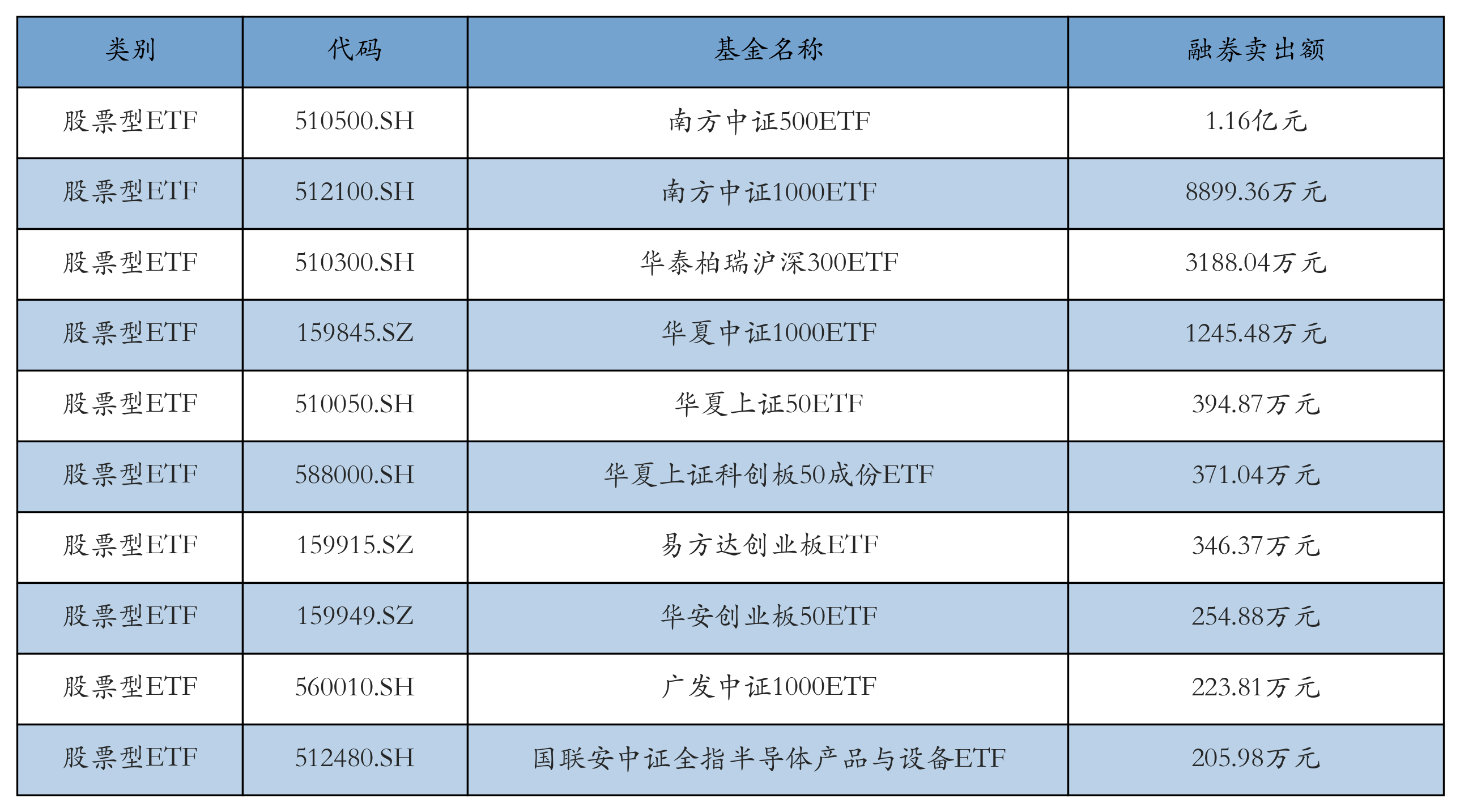 上一交易日股票型ETF融资卖出额最高的3支ETF及其卖出金额分别为:南方中证500ETF(1.16亿元)、南方中证1000ETF(8899.36万元)、华泰柏瑞沪深300ETF(3188.04万元)。融券卖出额前10详情见下表: