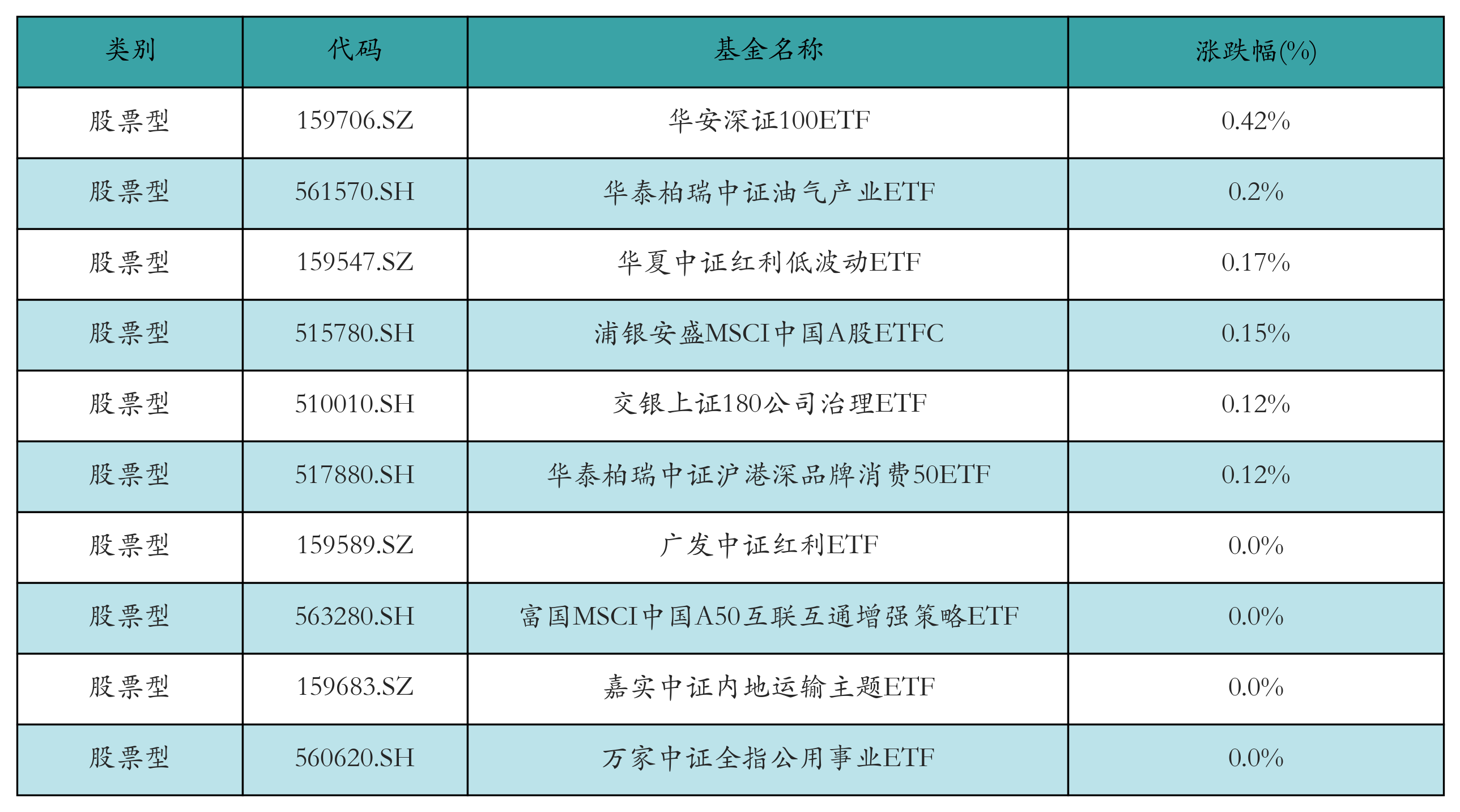 上一交易日股票型ETF涨幅最高的3支ETF及其收益率分别为:华安深证100ETF(0.42%)、华泰柏瑞中证油气产业ETF(0.2%)、华夏中证红利低波动ETF(0.17%)。涨幅前10详情见下表: