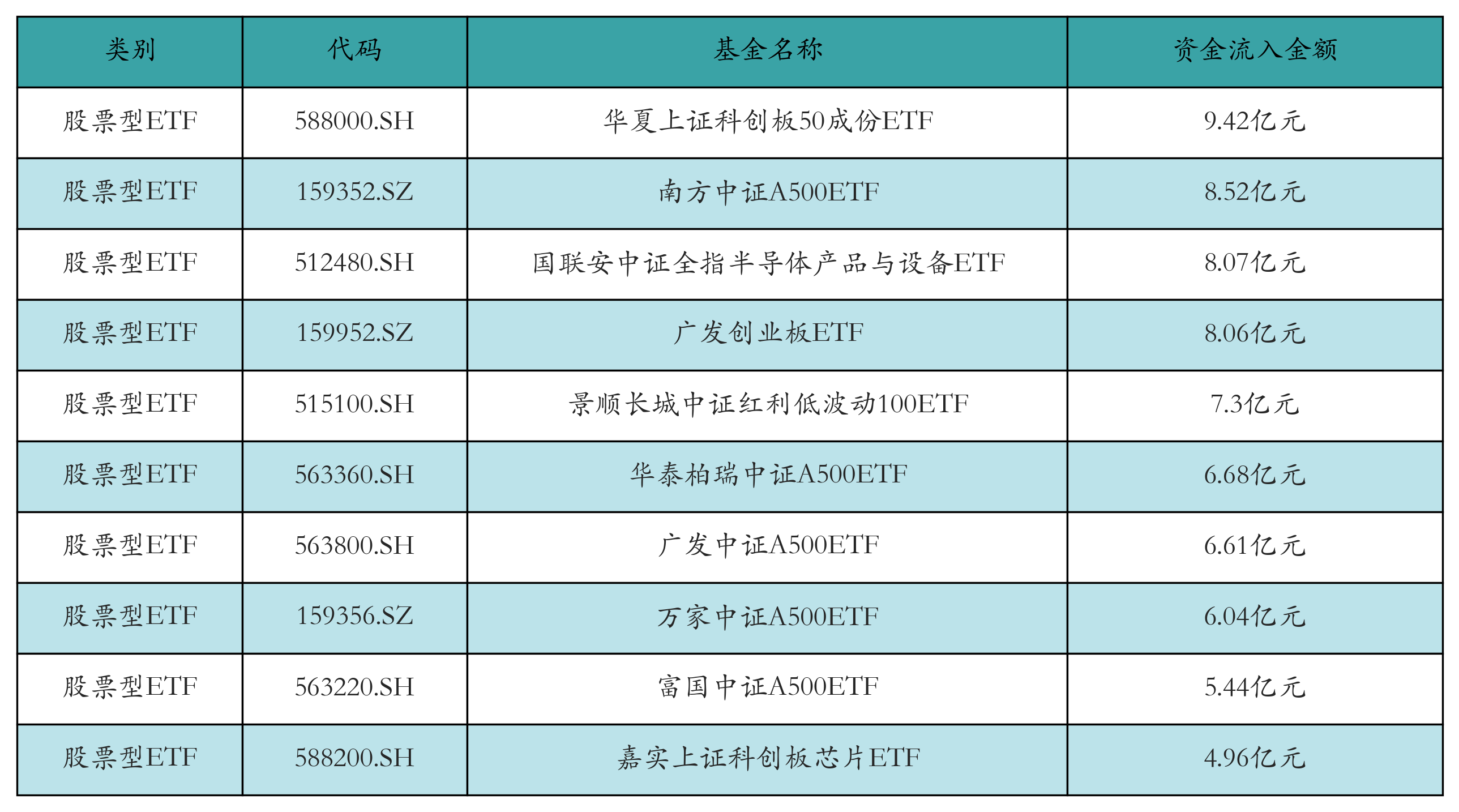 上一交易日股票型ETF资金流入最多的3支ETF及其流入金额分别为:华夏上证科创板50成份ETF(流入9.42亿元)、南方中证A500ETF(流入8.52亿元)、国联安中证全指半导体产品与设备ETF(流入8.07亿元)。资金流入前10详情见下表: