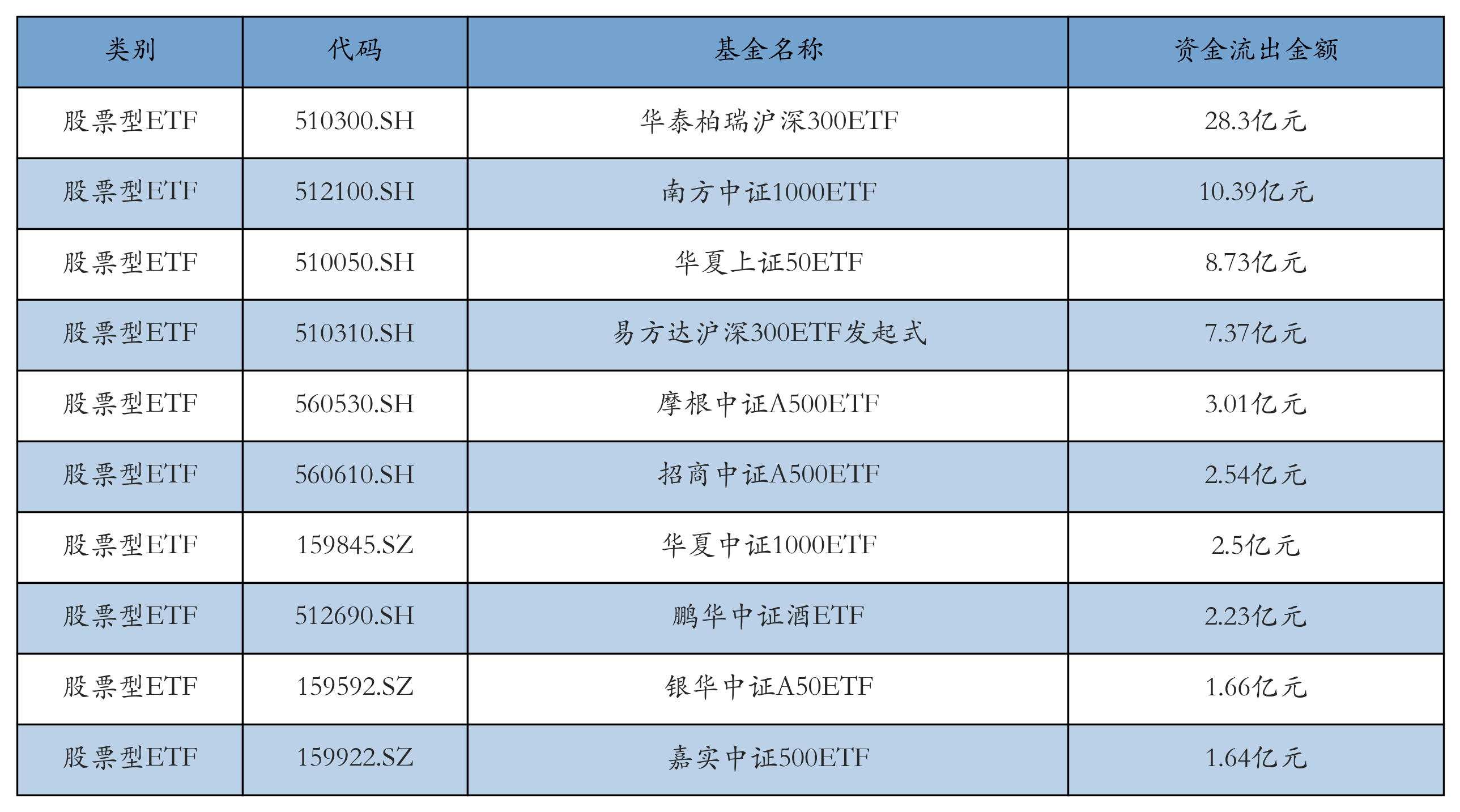 上一交易日股票型ETF资金流出最多的3支ETF及其流出金额分别为:华泰柏瑞沪深300ETF(流出28.3亿元)、南方中证1000ETF(流出10.39亿元)、华夏上证50ETF(流出8.73亿元)。资金流出前10详情见下表: