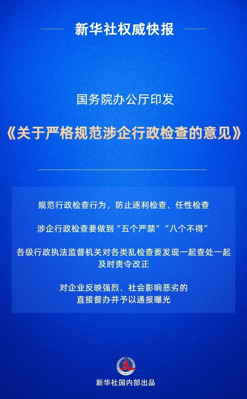 国务院办公厅印发的《关于严格规范涉企行政检查的意见》1月3日发布,严格规范涉企行政检查,坚决遏制乱检查,切实减轻企业负担。