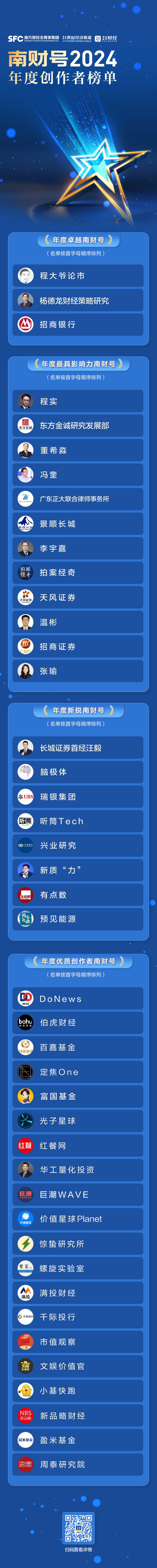 为感谢这些优秀的创作者们,南财号平台发布了 “2024年度创作者榜单”。榜单以账号内容专业性、内容传播力、账号活跃度、账号影响力、用户喜爱度等五大维度为评价指标,全面、客观地衡量了创作者的综合实力。通过综合评估南财号平台 3300 多名创作者的全年表现,最终43名创作者脱颖而出,获得了 “年度卓越南财号”“年度最具影响力南财号”“年度新锐南财号”“年度优质创作者南财号” 等荣誉。