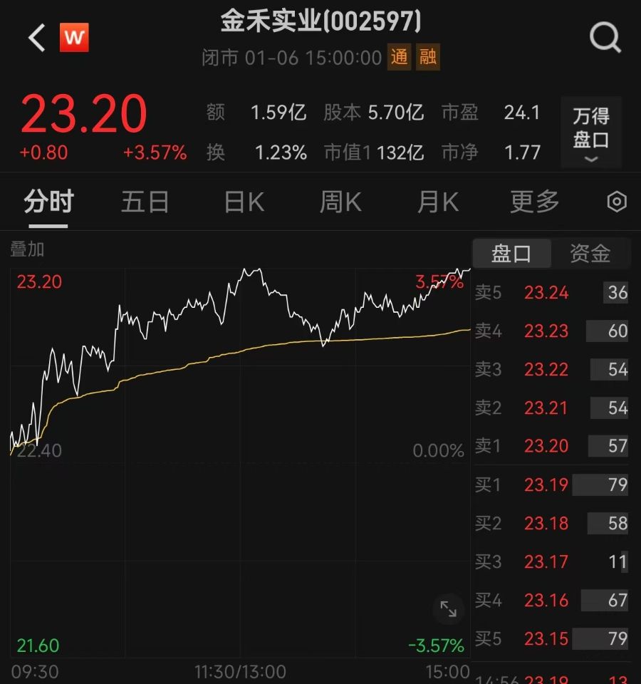 截至今日收盘,金禾实业上涨3.57%,报每股23.20元,总市值为132.23亿元。