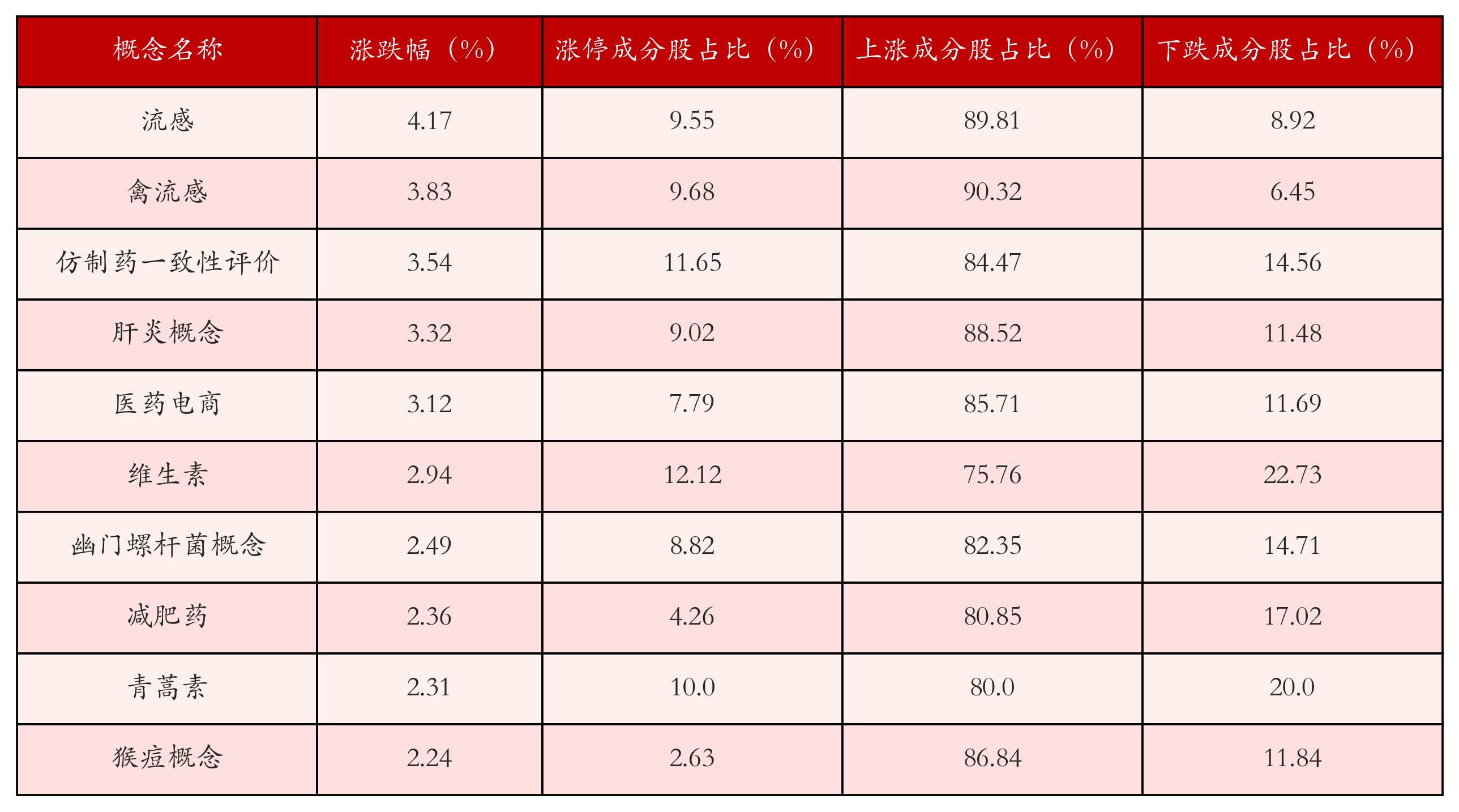 根据A股概念涨跌幅与所对应的股票池综合分析,涨幅靠前的三个概念板块分别为:流感、禽流感与仿制药一致性评价。排名前10位的概念板块相关数据见下表: