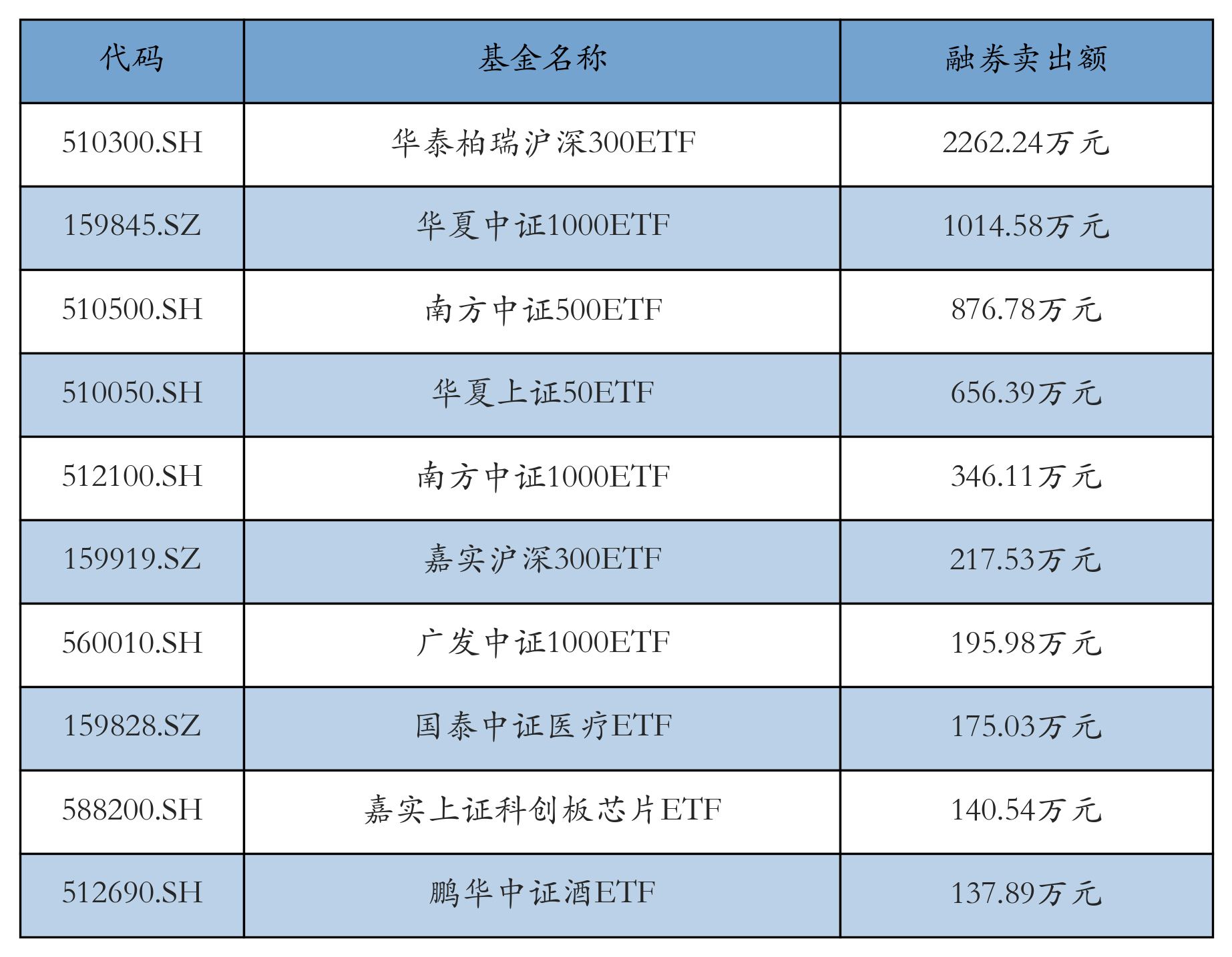 1月3日ETF融券卖出额前三位分别为:华泰柏瑞沪深300ETF(2262.24万元)、华夏中证1000ETF(1014.58万元)和南方中证500ETF(876.78万元),前10具体见下表: