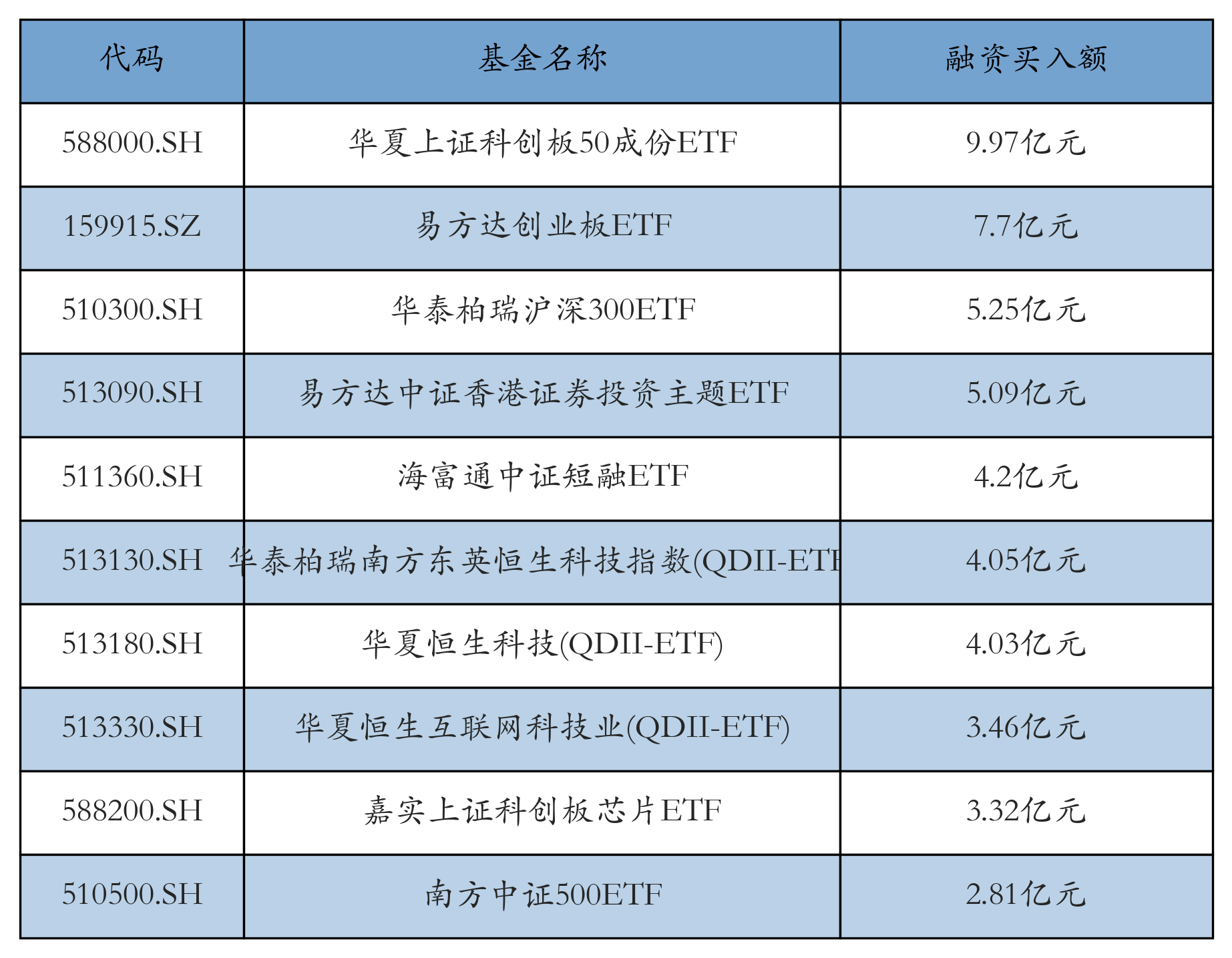 1月3日ETF融资买入额前三位分别为:华夏上证科创板50成份ETF(9.97亿元)、易方达创业板ETF(7.7亿元)和华泰柏瑞沪深300ETF(5.25亿元),前10具体见下表:
