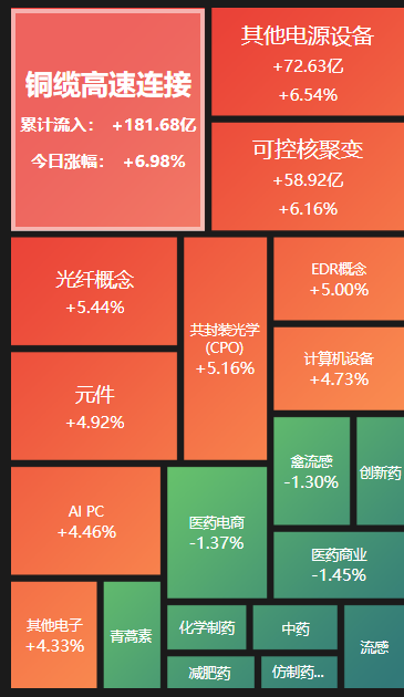 板块题材上,数据电源中心、铜缆高速连接、可控核聚变、半导体板块涨幅居前;流感、中药板块跌幅居前。