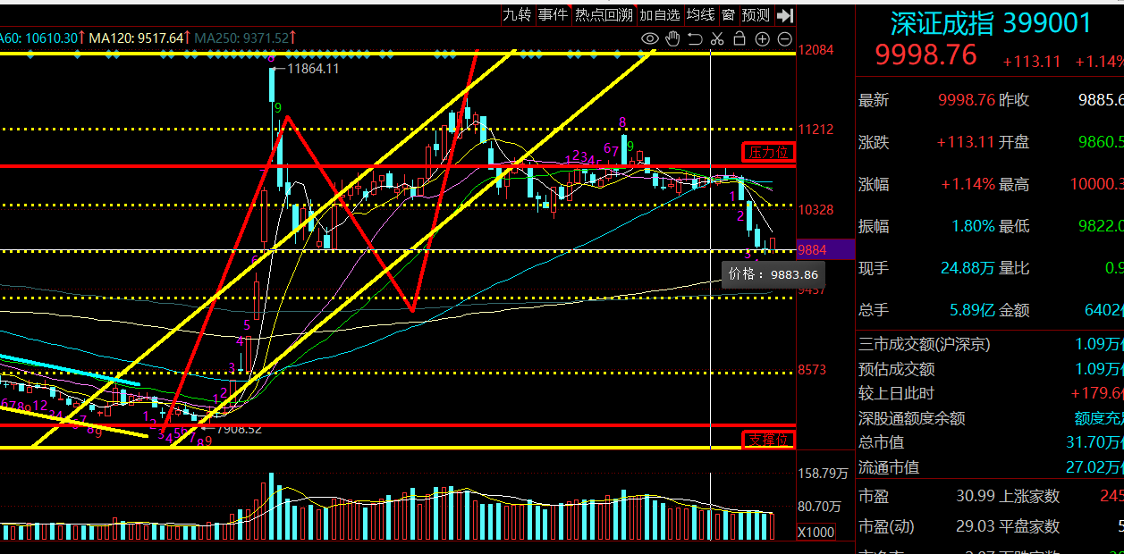 由于国内外变化比较大,政策处于中空期,在连续调整之后,市场出现明显的反弹,同时深证成指也已经在黄金分割线的支撑。部分投顾标的可以中期继续关注,毕竟市场目前处于相对的低位。而本次的技术性反弹仍旧会有一定的持续,尤其部分标的已经明显出现量能放大,因此可以继续关注。深证成指在黄金分割线50%上方的支撑比较明显,一旦重新突破5天均线,还是会有延续反弹的可能。