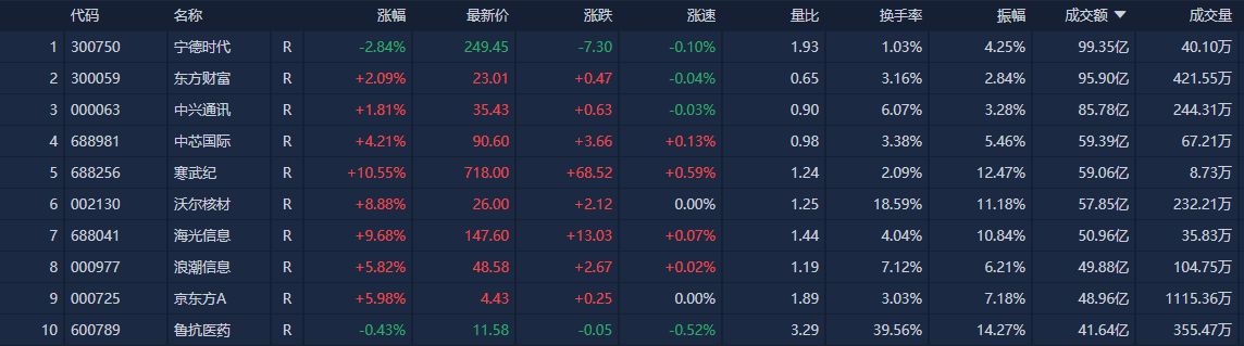个股方面,宁德时代成交额居首,为99.35亿元。其次是东方财富、中兴通讯、中芯国际、寒武纪,成交额分别为95.90亿元、85.78亿元、59.39亿元、59.06亿元。