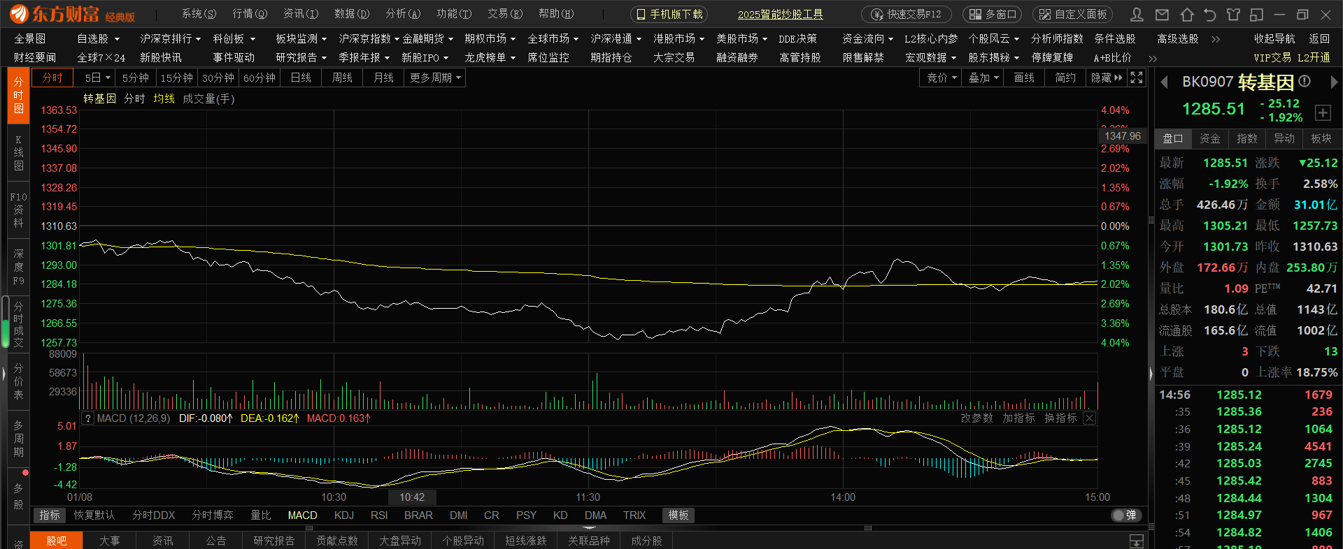 下跌方面,转基因概念股走低,荃银高科跌超7%。