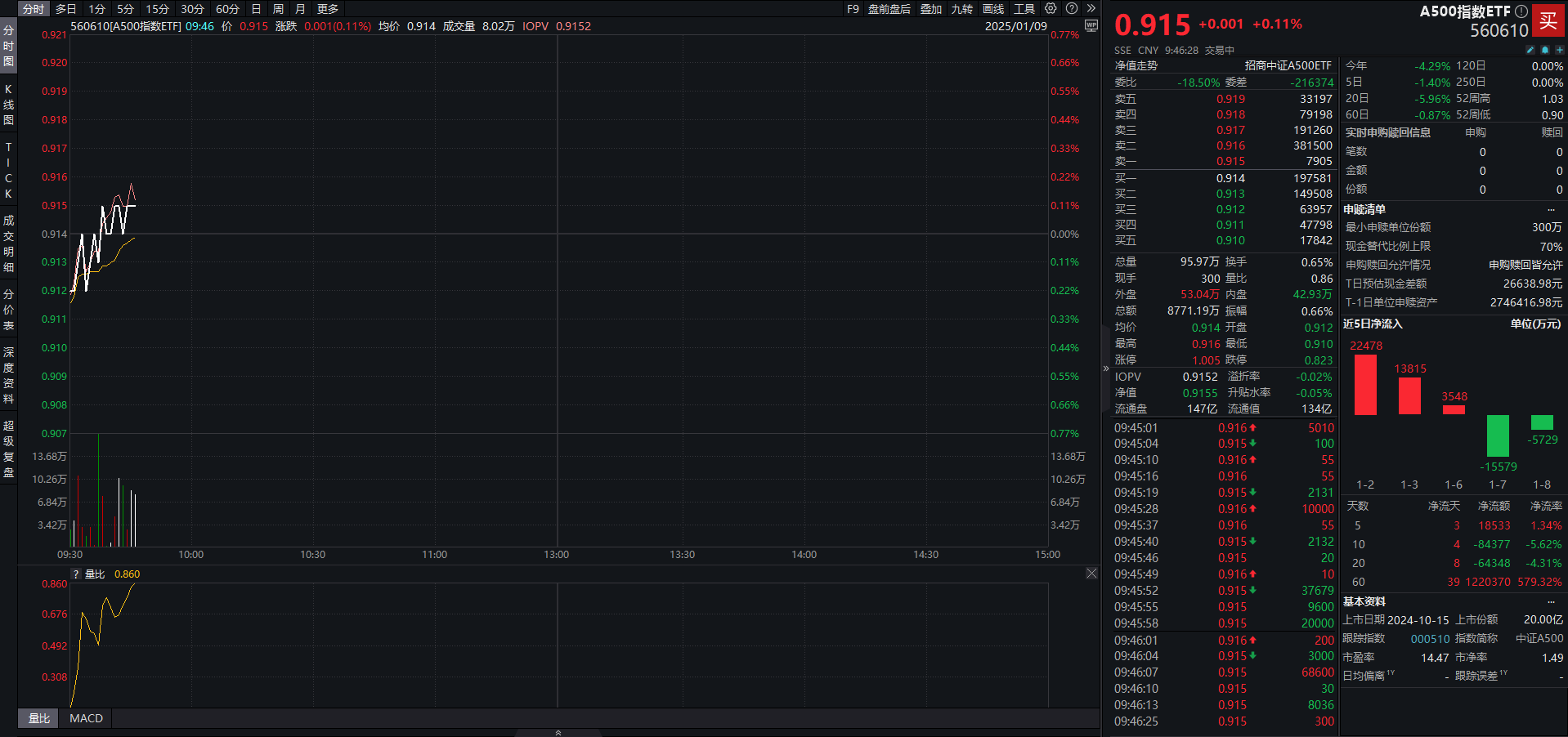 1月9日,A股三大指数集体低开后拉升翻红,截至发稿,ETF方面,A500指数ETF(560610)翻红涨0.11%,成交额超8700万元,成交持续活跃。