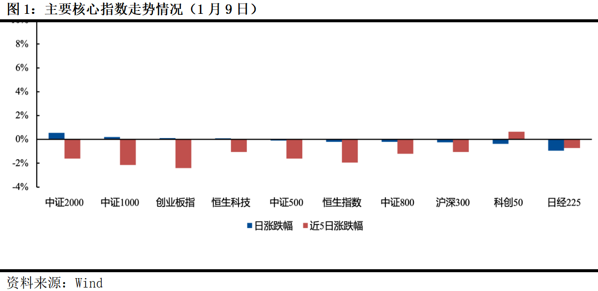 今日中证2000、中证1000、创业板指走势排名靠前,日涨跌幅分别为0.54%、0.19%和0.11%;近5个交易日科创50、日经225、恒生科技的走势排名靠前,近5日涨跌幅分别为0.64%、-0.73%和-1.06%。