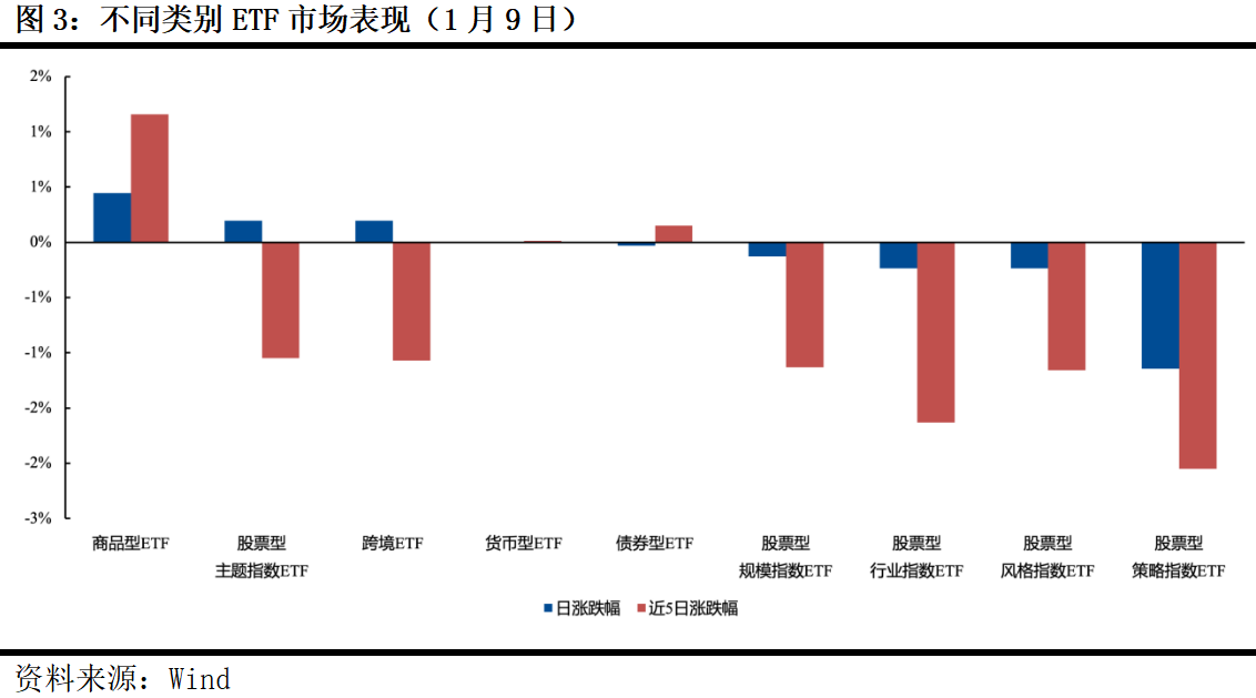 今日(1月9日,下同),市场全天窄幅震荡,三大指数多数上涨。上证指数跌0.58%,深证成指涨0.32%,创业板指涨0.11%。国防军工板块(申万一级)今日领涨,多只国防军工板块ETF上扬,军工龙头ETF(512710)涨2.99%,高端装备ETF(159638)涨2.54%,国防ETF(512670)涨2.49%。
