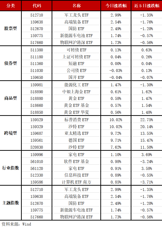 今日不同类型ETF产品中走势排名前5的基金如下表所示,其中,股票型ETF涨幅最高的3只ETF产品分别为军工龙头ETF(512710)、高端装备ETF(159638)、国防ETF(512670),今日收益率分别为2.99%、2.54%和2.49%。