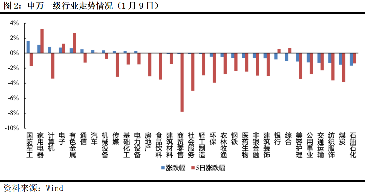统计全部申万一级行业今日涨跌幅情况,国防军工、家用电器、计算机今日走势排名靠前,日涨跌幅分别为1.63%、1.11%和0.85%,纺织服饰、煤炭、石油石化的走势排名靠后,日涨跌幅分别是-1.3%、-1.54%和-1.67%;近5个交易日家用电器、有色金属、电子的走势排名靠前,近5日涨跌幅分别为3.23%、2.68%和1.26%,环保、社会服务、商贸零售的走势排名靠后,近5日涨跌幅分别为-3.94%、-5.02%和-7.81%。