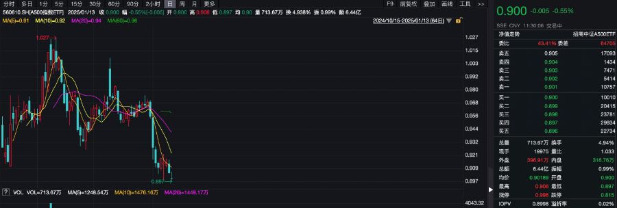 相关ETF方面,A500ETF指数(560610)截至午间收盘跌0.55%,成交额6.44亿元,换手率4.94%,早盘交投活跃,溢折率0.02%,盘中频现溢价交易。