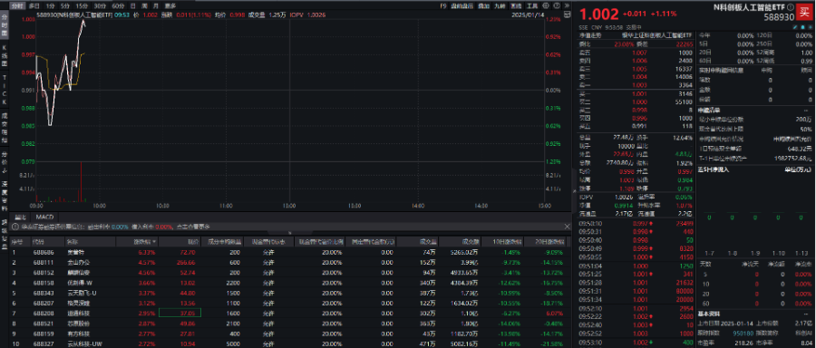 截至2025年1月14日,按照申万一级分类,科创AI指数成分股主要聚焦于电子(53.5%)、计算机(31.4%)、家用电器(9.4%)、机械设备(3.5%)、通信(2.1%)这五大行业赛道。