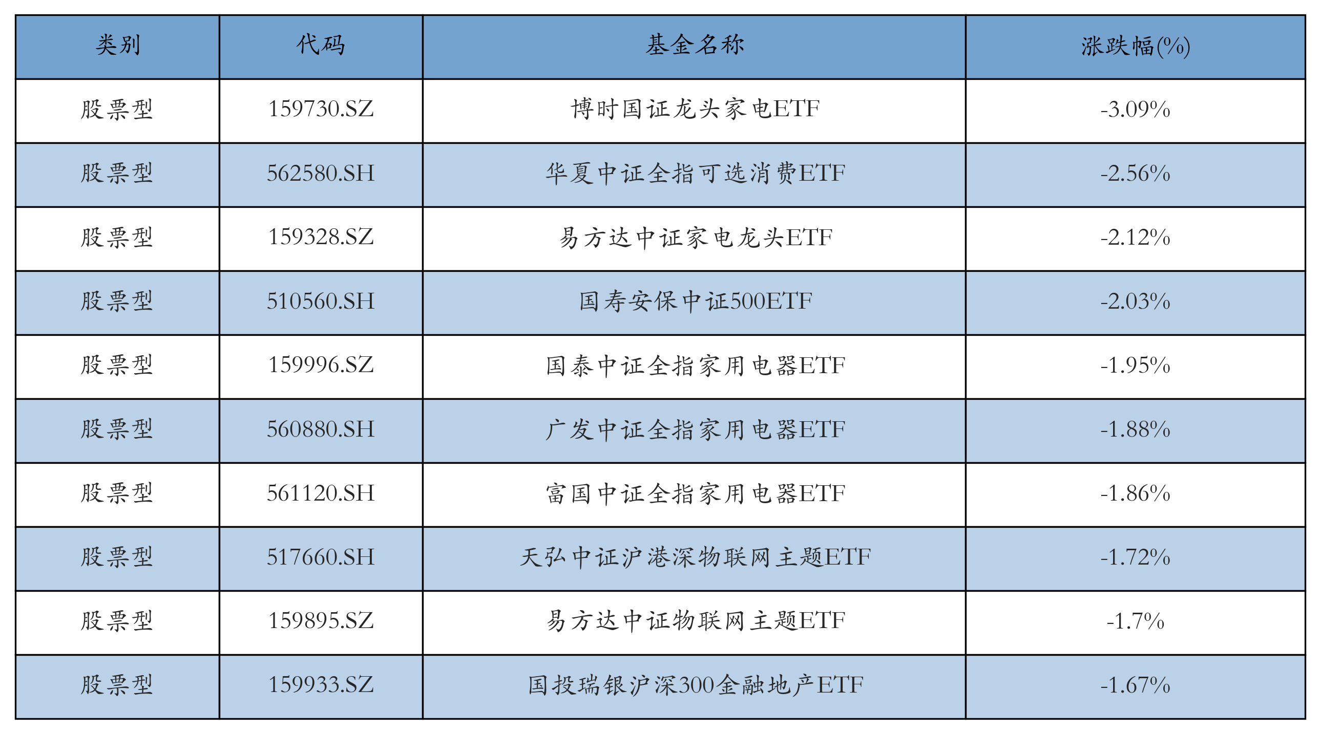 昨日股票型ETF跌幅最大的3支ETF及其收益率分别为:博时国证龙头家电ETF(-3.09%)、华夏中证全指可选消费ETF(-2.56%)、易方达中证家电龙头ETF(-2.12%)。跌幅前10详情见下表:
