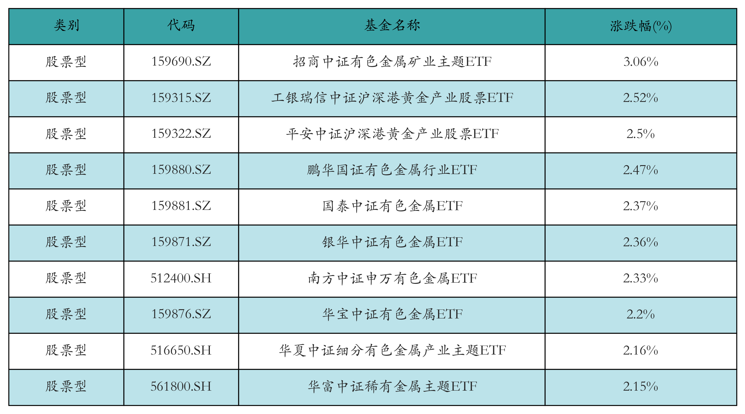 昨日股票型ETF涨幅最高的3支ETF及其收益率分别为:招商中证有色金属矿业主题ETF(3.06%)、工银瑞信中证沪深港黄金产业股票ETF(2.52%)、平安中证沪深港黄金产业股票ETF(2.5%)。涨幅前10详情见下表: