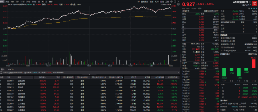 热门ETF中,A500指数ETF(560610)1月14日涨2.89%,成交额14.45亿元,换手率10.76%,全天交投活跃;收盘时溢折率为0.04%。成分股方面,蓝色光标20CM涨停,蓝思科技涨超19%,同花顺、机器人、润和软件、捷成股份、利亚德等股涨超10%。