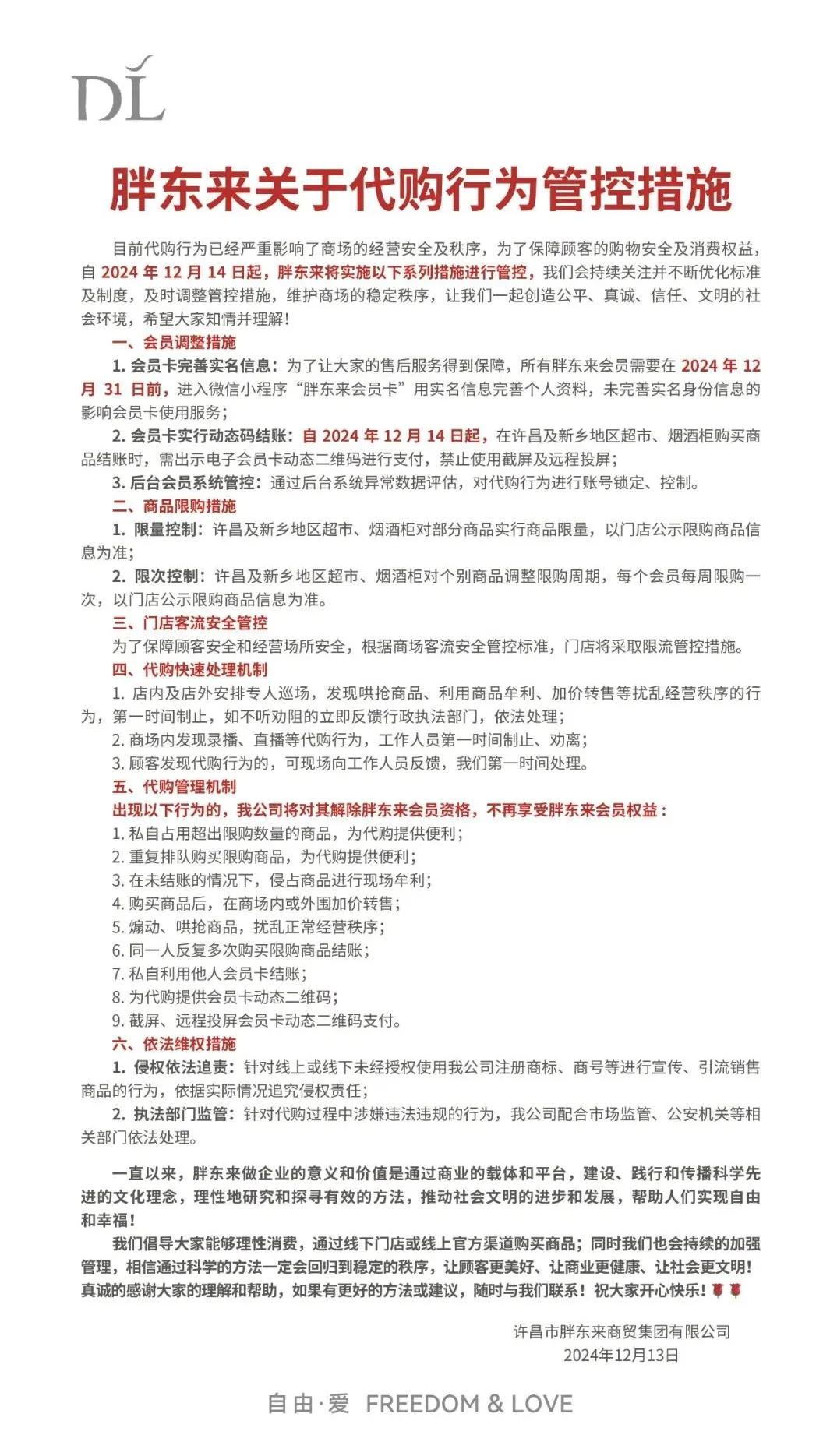 首先是会员调整。所有胖东来会员需要在2024年12月31日前,在“胖东来会员卡”微信小程序完成实名信息认证。同时,从2024年12月14日起在许昌及新乡地区超市烟酒柜购买商品结账时,需出示电子会员卡动态二维码进行支付,不得使用截屏或远程投屏。一旦发现后台数据异常,将对代购行为进行账号锁定和控制。