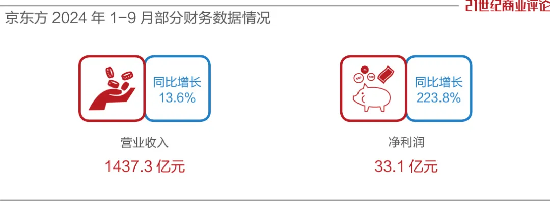 财报显示,2024年1至9月,京东方营收为1437.3亿元,同比增长13.6%;净利润为33.1 亿元。