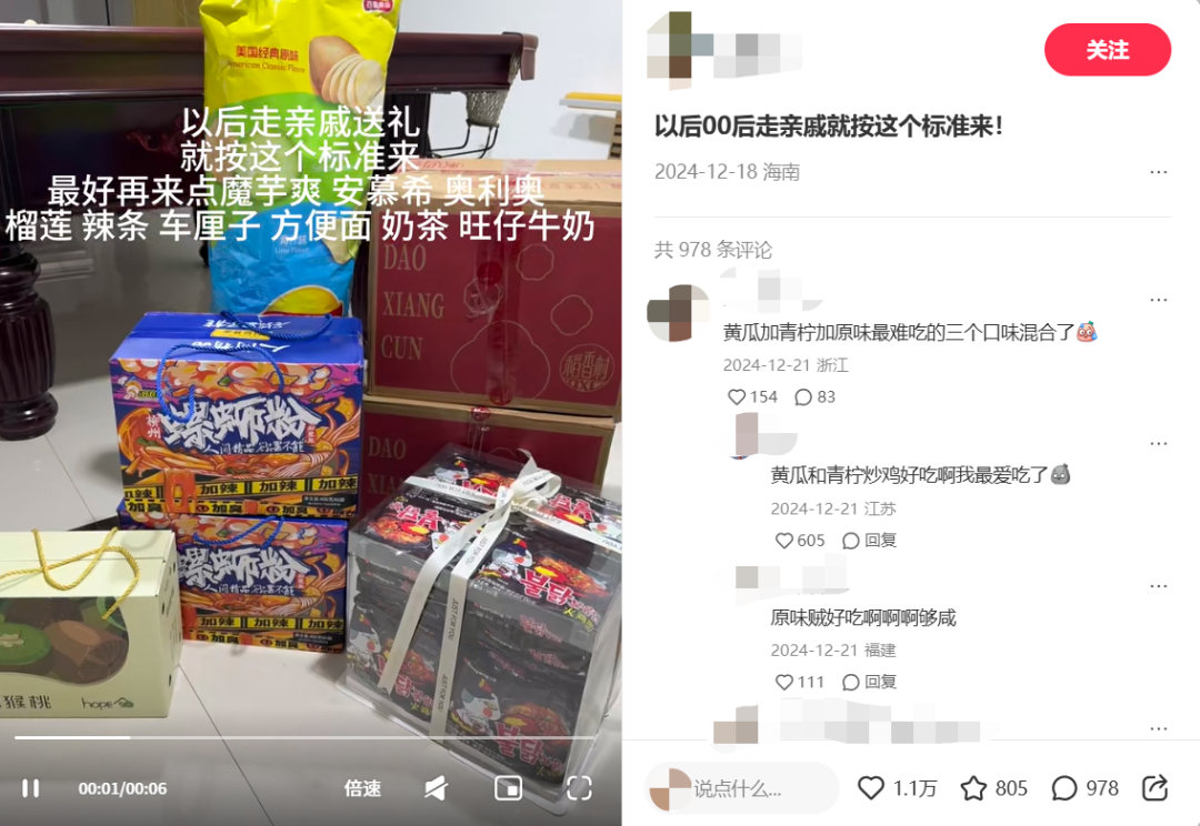 随着“第一批回家过年的00后已就位”,这届年轻人也逐渐掌握了家中年货的采买大权。螺蛳粉、火鸡面、奶茶、干噎酸奶、碱水面包……正如在婚宴上用喜茶代酒,如今年轻人的年货清单里,也出现越来越多意想不到的产品。