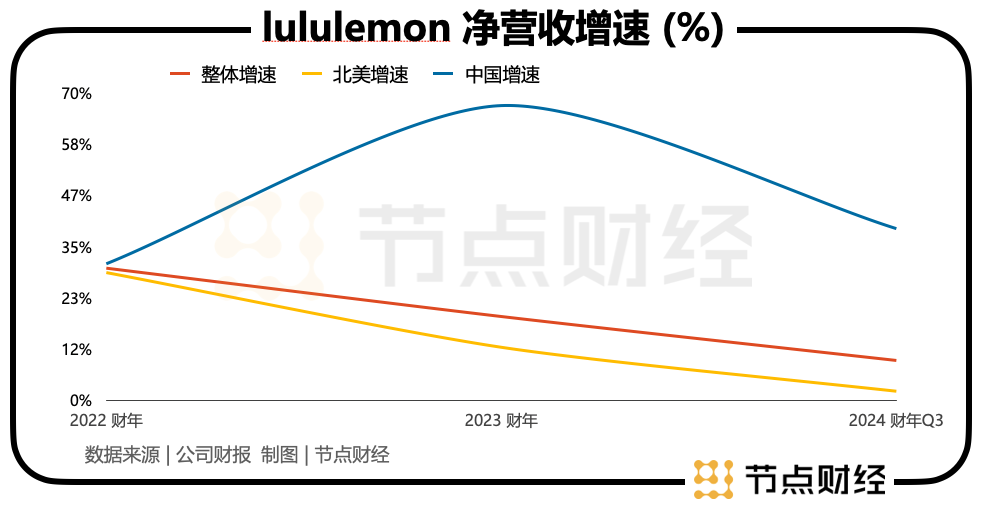 2024年12月6日,lululemon发布了2024年财年第三季度财报,显示其全球净营收为24亿美元,同比增长9%;其中占总营收七成以上的北美地区净营收17.7亿美元,同比增长仅2%。