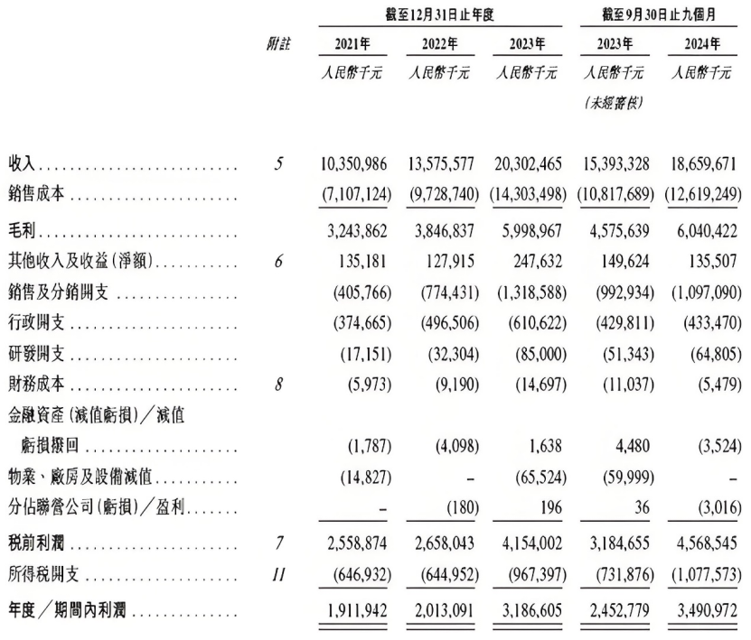 2024年前三季度,蜜雪冰城实现营业收入187亿元,同比增长21.2%;净利润35亿元,同比增长42.3%,营利均保持双位数高增长。