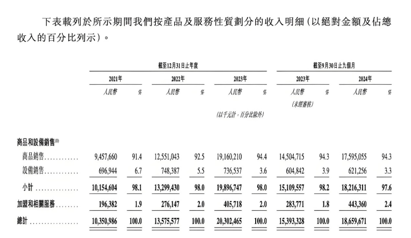 2024年前9个月,蜜雪冰城的加盟和相关服务收入为4.4亿元,仅占总营收的2.4%;向加盟商销售设备的收入约为6.2亿元,占总收入的3.3%,约95%的公司收入,其实是来自向加盟商销售物料(包含糖、奶、茶、咖、果、小料等材料),收入约为176亿元。