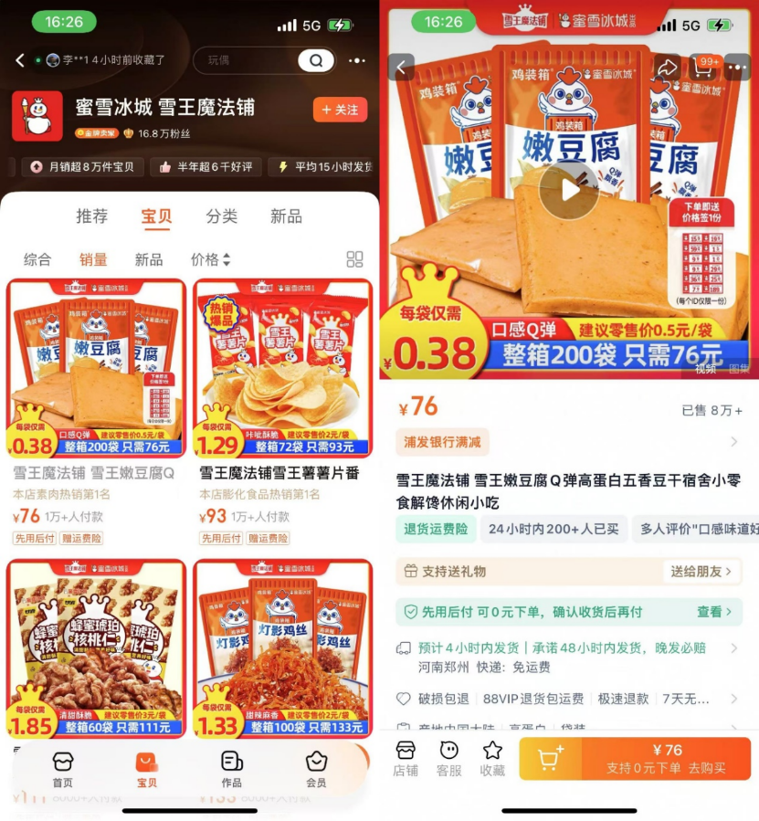 此外,雪王还在淘宝开设了“雪王魔法铺”,销售茶系列、口袋零食系列、咖啡系列、杯子系列、文创周边系列等系列产品,目前该店销量最高的嫩豆腐干,已售出8万+份。