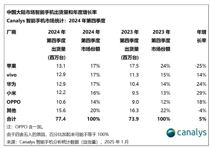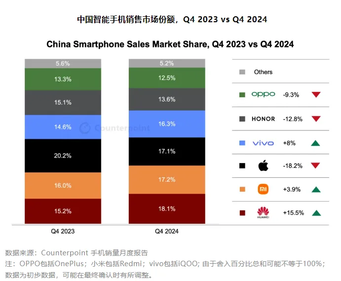 据悉,2024年四季度华为手机销售市场份额同比增长15.5%,小米手机销售市场份额同比增长3.9%,而苹果的手机销售市场份额则同比减少18.2%。
