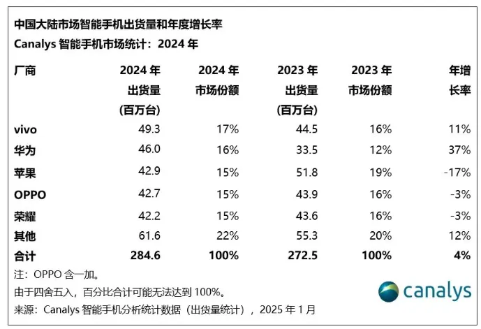 Canalys1月16日发文指出,2024年中国大陆智能手机市场全年出货量达2.85亿台,在两年的下跌后顺利迎来复苏,同比温和增长4%。