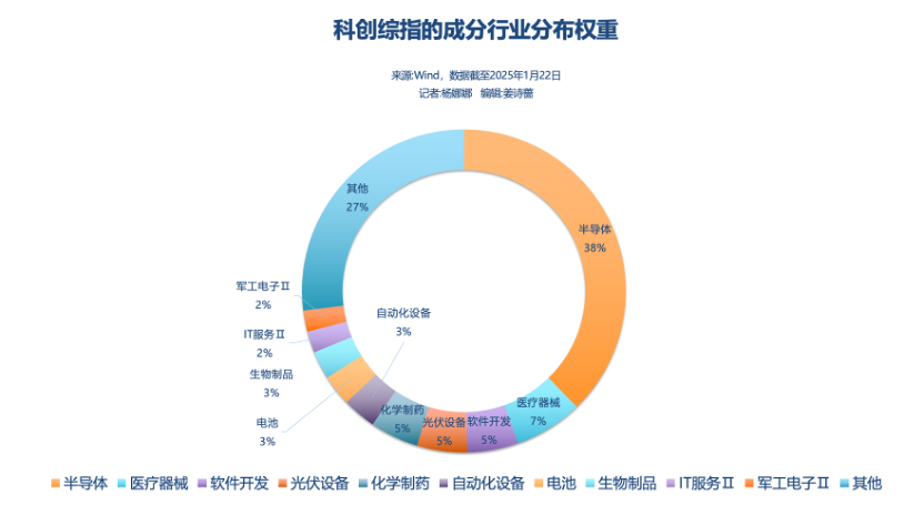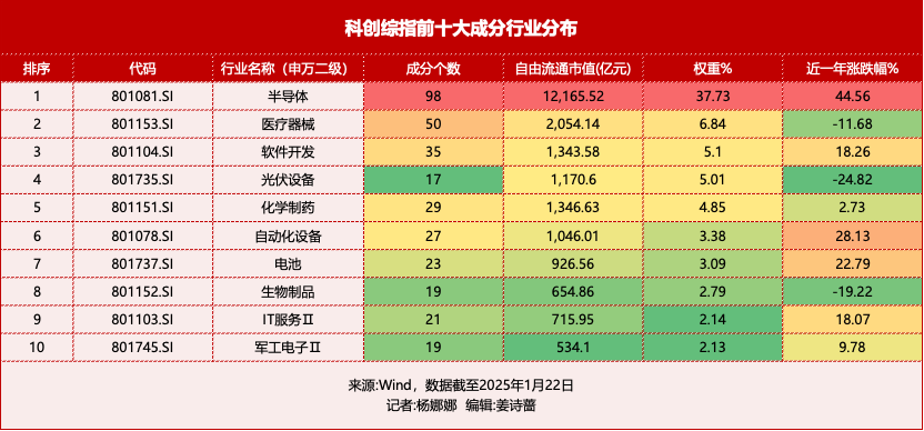 此外,科创综指行业分布较为均衡,与科创板全市场整体水平基本一致。前五大权重成分行业分别是半导体、医疗器械、软件开发、光伏设备和化学制药。