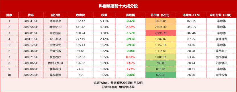 从成分股权重来看,排在前三大的分别是海光信息、寒武纪和中芯国际。截至1月22日,海光信息的权重占比为5.11%,总市值超过3000亿元。