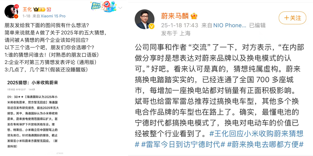 相比于小米方面“不予回应”的态度,蔚来汽车品牌与传播助理副总裁马麟则是明确表示,公司已经与研报作者进行了沟通,对方在内部做分享时想表达对蔚来换电的认可,猜想纯属虚构。