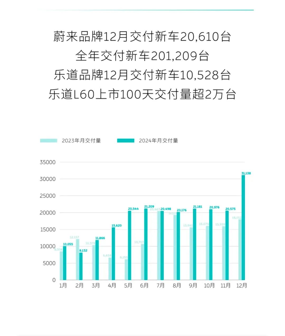 以在去年3月发布的2024款蔚来EC6为例,在2024年12月的销量为7406辆。再如蔚来重磅推出的乐道L60,在去年12月份刚刚实现销量破万。