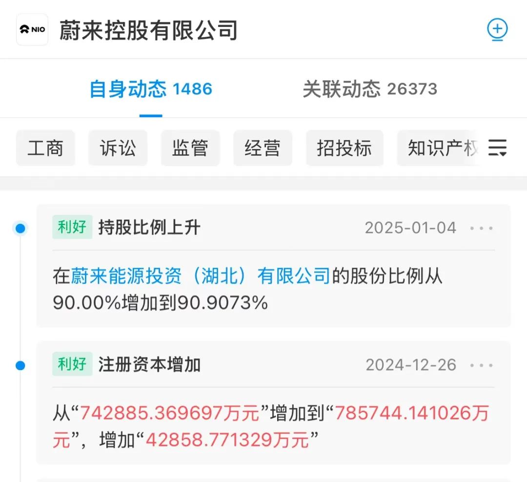 近日,蔚来控股有限公司还发生了工商变更,注册资本由约74.29亿元人民币增至约78.57亿元人民币。
