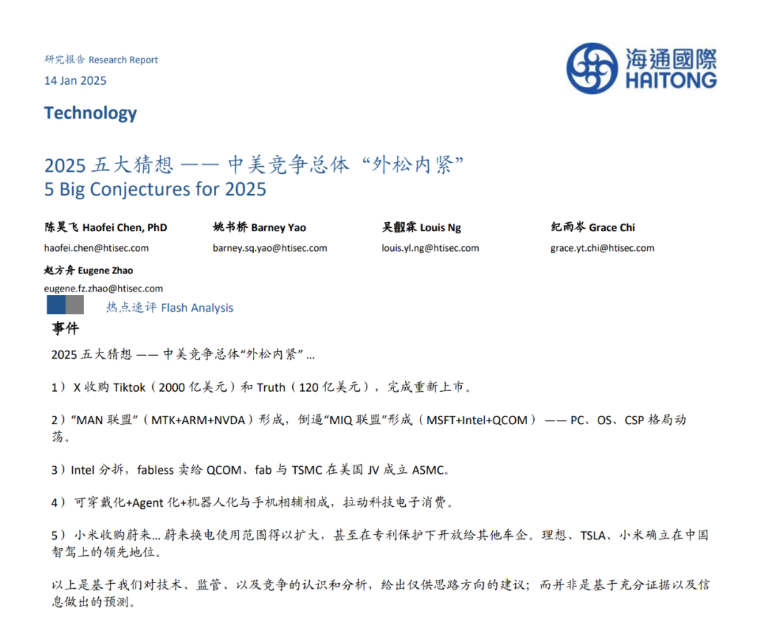 近日,海通国际证券发布了一则名为《2025五大猜想——中美竞争总体“外松内紧”》的研究报告。
