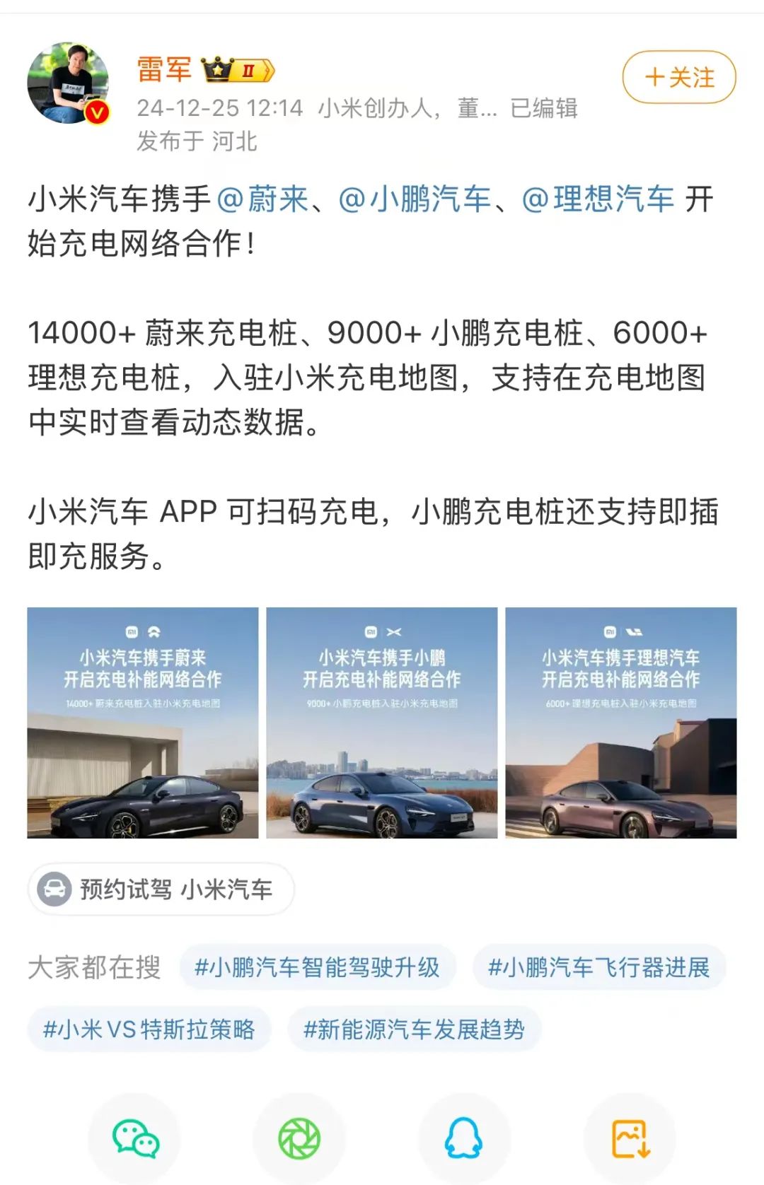 半年后的2024年12月25日,小米汽车官微发布消息称,小米汽车正式与蔚来开始充电补能网络合作,14000+蔚来充电桩入驻小米充电地图,支持在充电地图中实时查看蔚来充电场站的动态数据,同时支持小米汽车App扫码充电。