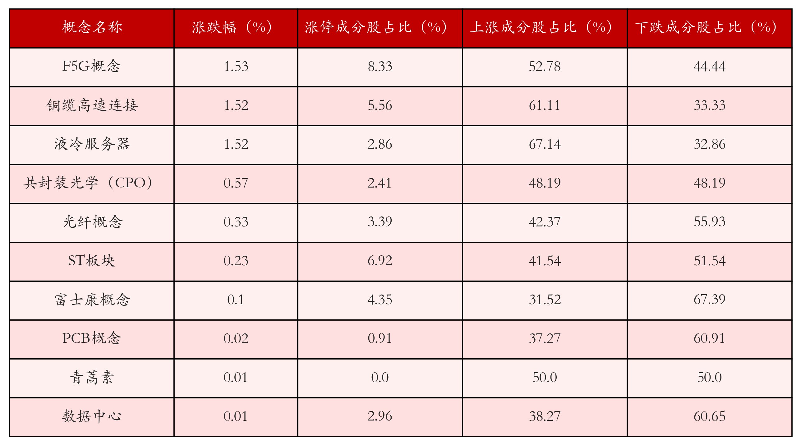 根据A股概念涨跌幅与所对应的股票池综合分析,涨幅靠前的三个概念板块分别为:F5G概念、铜缆高速连接与液冷服务器。排名前10位的概念板块相关数据见下表:
