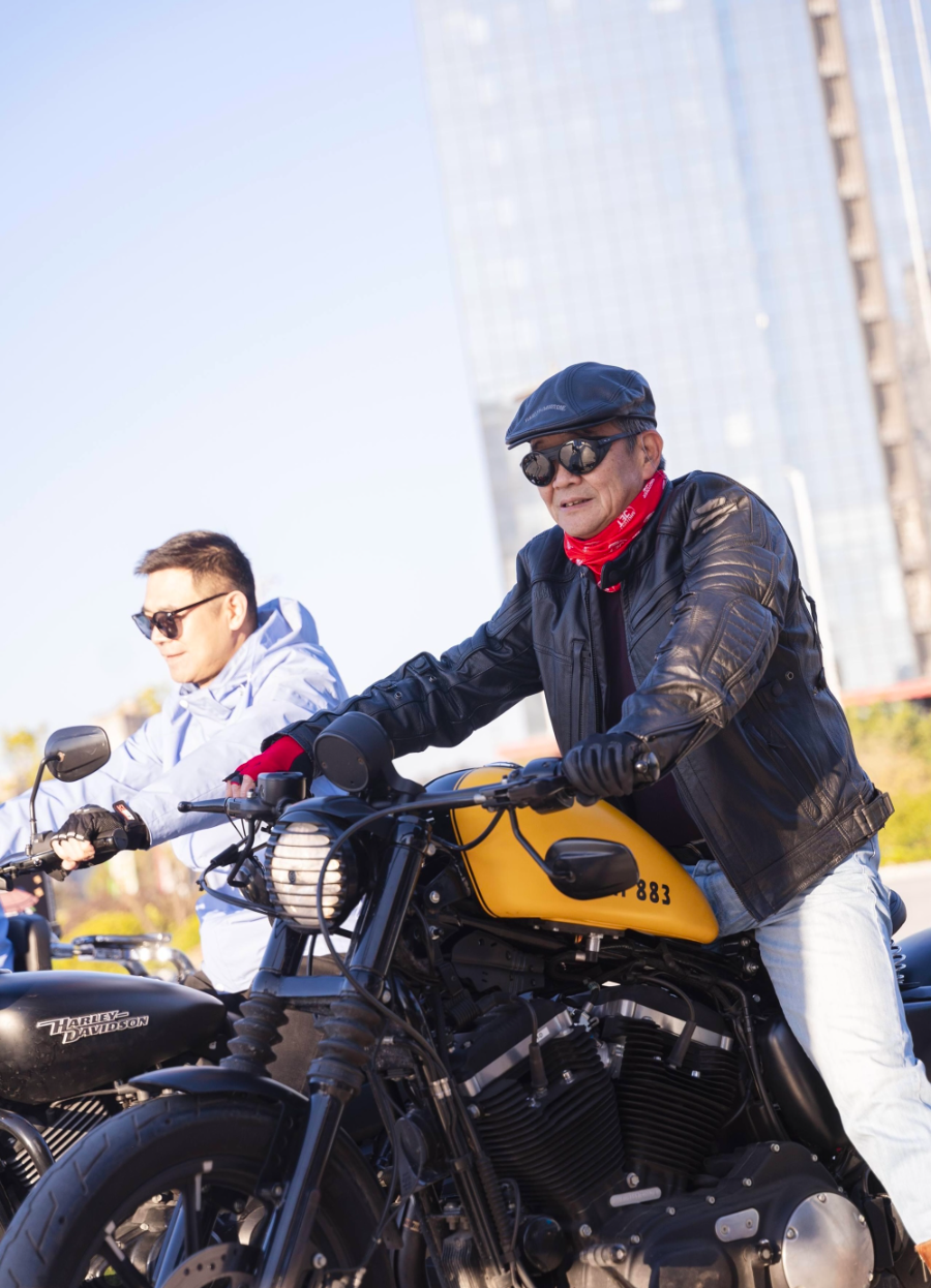 采访当天,正值医院员工运动会,汪建平的扮相酷飒全场——头发花白的他,戴着酷炫的飞行墨镜,身穿黑色机车夹克,系红色的防风围脖,一骑哈雷引领摩托车队浩荡入场,带动着运动会一波又一波的热潮。