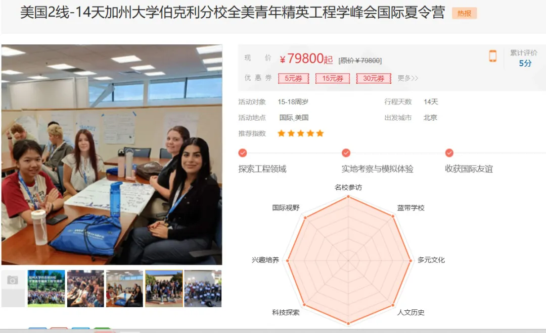 其国际游学营,价格不菲,若参加美国加州大学伯克利分校项目,每人需要支付79800元。