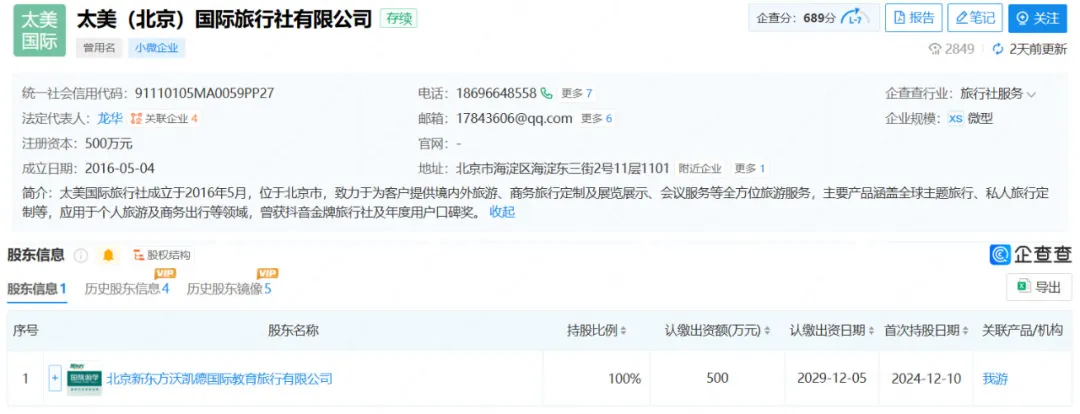12月,其又有新动作。沃凯德全资收购太美国际旅行社。这家旅行社成立于2016年5月,经营境内旅、入境游等业务。