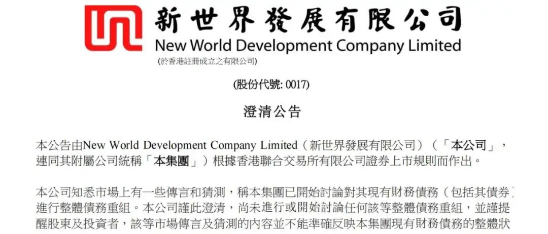 1月20日,新世界发展紧急澄清,“尚未进行或开始讨论任何现有财务债务(包括债券)的整体债务重组。”