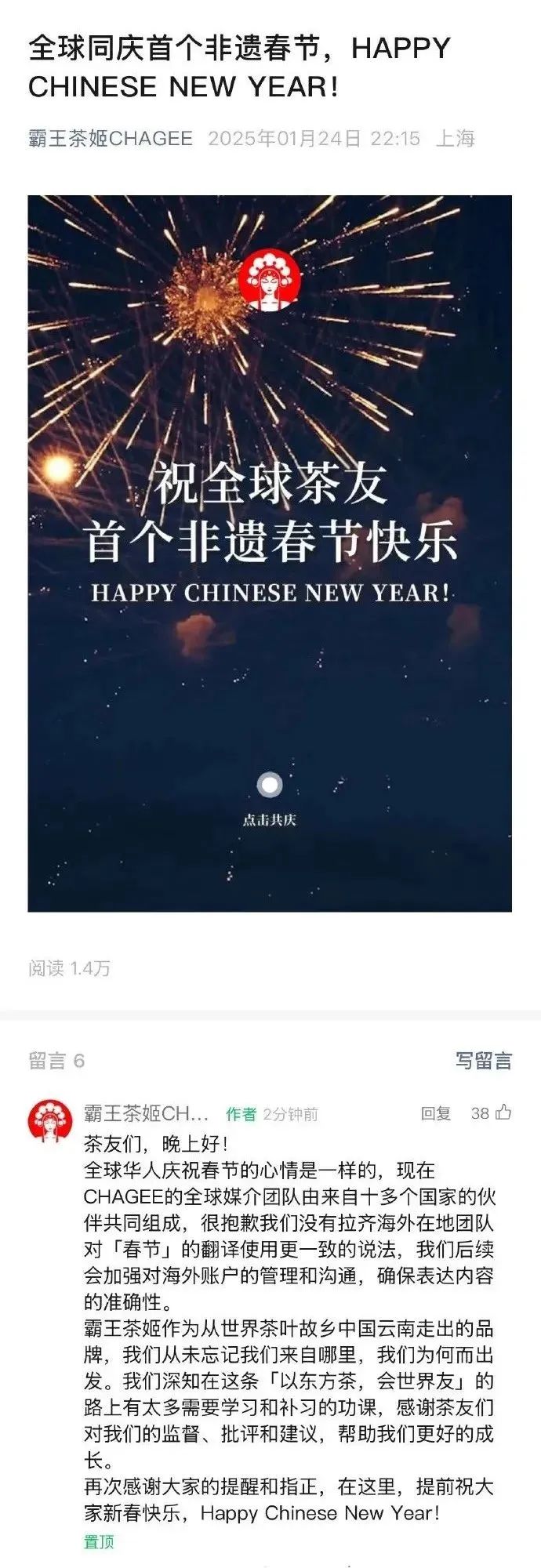 1月24日晚,霸王茶姬通过公众号就此事致歉。其表示:“很抱歉我们没有拉齐海外在地团队对‘春节’的翻译使用更一致的说法,我们后续会加强对海外账户的管理和沟通,确保表达内容的准确性。”