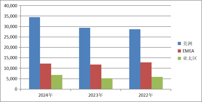 图:高盛近三年全球各区域的收入分布(百万美元)