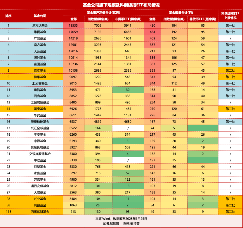 但指数型(概念类)基金规模排在前20名中的不少“指数大厂”并未出现在第一批科创综指ETF的布局名单中,比如嘉实基金、广发基金、国泰基金等。