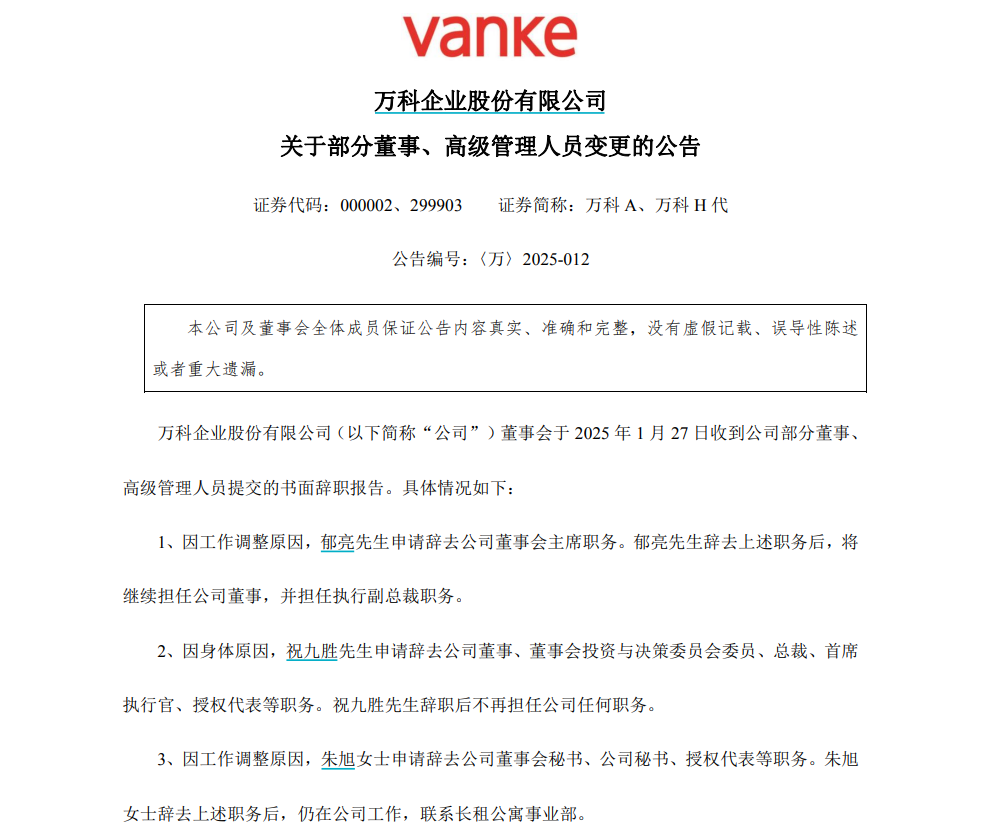 1月27日,万科A公告,因工作调整原因,郁亮先生申请辞去公司董事会主席职务。郁亮先生辞去上述职务后,将继续担任公司董事,并担任执行副总裁职务。祝九胜先生申请辞去公司董事、董事会投资与决策委员会委员、总裁、首席执行官、授权代表等职务。祝九胜先生辞职后不再担任公司任何职务。朱旭女士申请辞去公司董事会秘书、公司秘书、授权代表等职务。朱旭女士辞去上述职务后,仍在公司工作,联系长租公寓事业部。